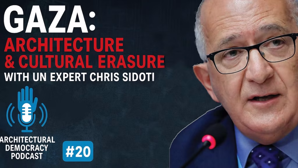 In this landmark episode nr 20 of the Architectural Democracy Podcast, hosts Pedro Aibéo and Mark Linder engage in a sobering and insightful conversation with Chris Sidoti, internationally renowned human rights lawyer and former member of the UN Independent Commission of Inquiry on the Occupied Palestinian Territory.